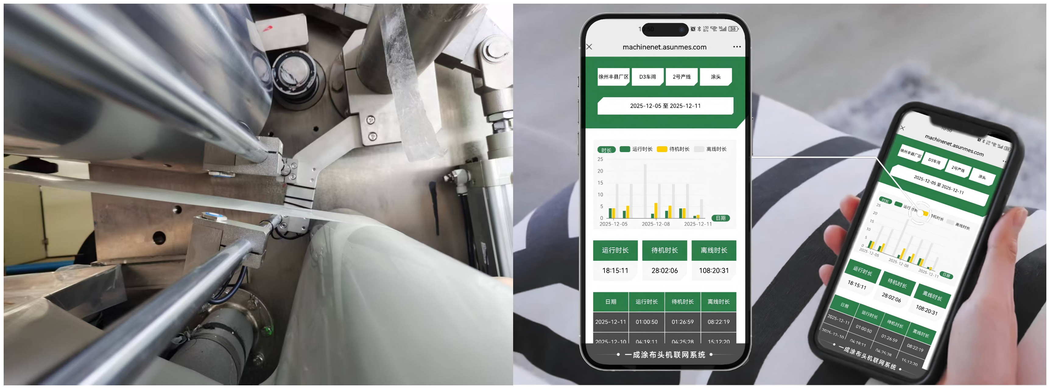 無視基材、接頭差異,可精準(zhǔn)識(shí)別并自動(dòng)跳過接頭、精準(zhǔn)復(fù)位的智能跳刀,解放人工,減少浪費(fèi),避免失誤造成斷紙風(fēng)險(xiǎn);數(shù)據(jù)實(shí)時(shí)互聯(lián),生產(chǎn)實(shí)況全景可視的機(jī)聯(lián)網(wǎng)系統(tǒng),將生產(chǎn)現(xiàn)場(chǎng)化為觸手可及的清晰數(shù)據(jù)。通過手機(jī)即可隨時(shí)隨地查看車間生產(chǎn)情況。涂布厚度、運(yùn)行速度等核心參數(shù)實(shí)時(shí)同步,精準(zhǔn)呈現(xiàn)真實(shí)產(chǎn)量、設(shè)備利用率與工藝波動(dòng)趨勢(shì),讓每一次決策都有據(jù)可依